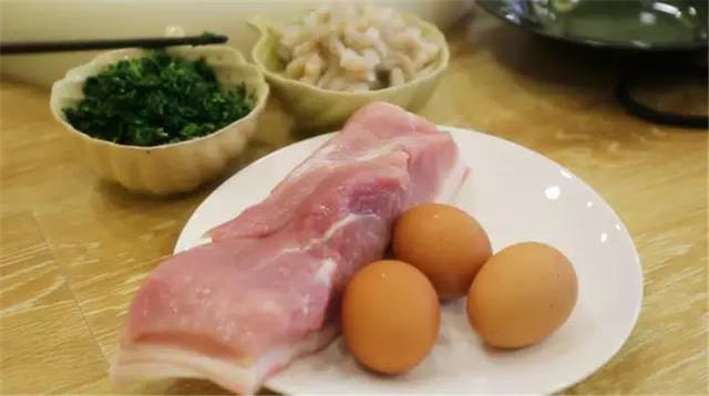 豬前腿肉、雞蛋、薺菜、蝦仁、餛飩皮、鹽、雞精、色拉油、黑芝麻、蔥;